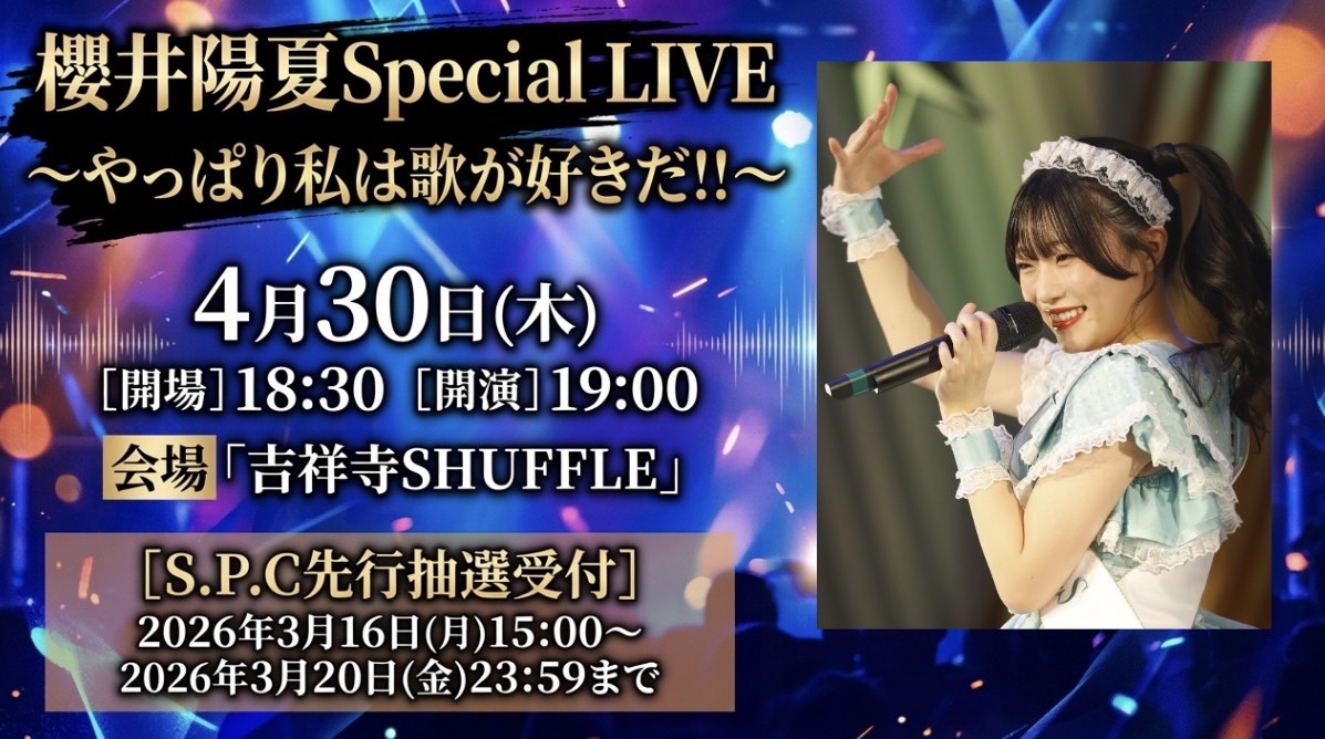 4月30日(木)開催「櫻井陽夏Special LIVE~やっぱり私は歌が好きだ!!~」S.P.C先行抽選受付が3月16日(月)15:00スタート!