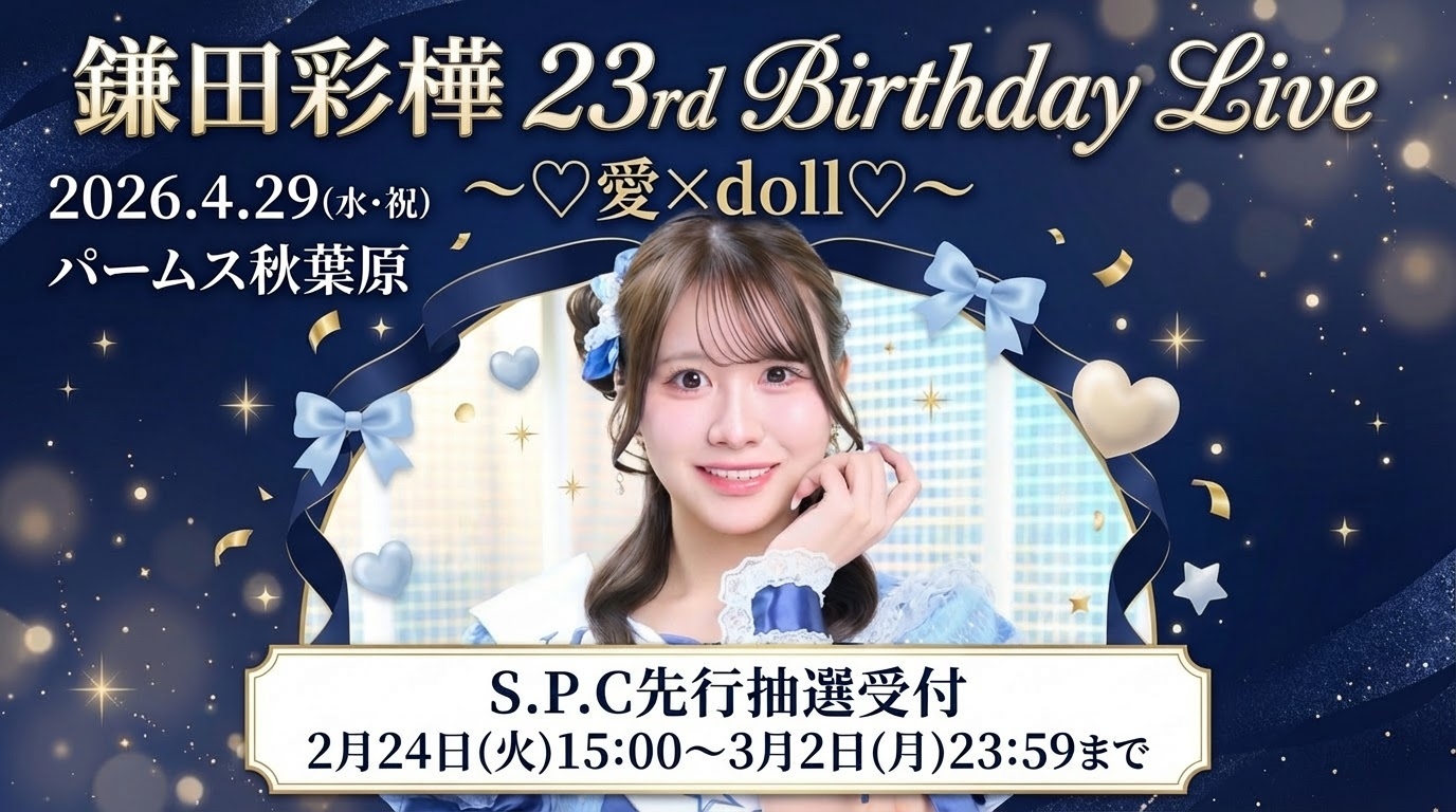 4月29日に鎌田彩樺の生誕ライブ「鎌田彩樺 23rd Birthday Live ~♡愛×doll♡~」S.P.C先行受付は2月24日15:00から!
