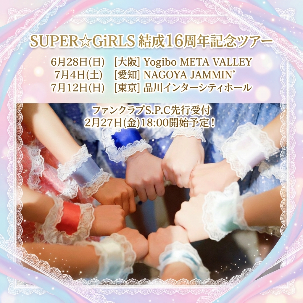SUPER☆GiRLS 結成16周年ライブツアーの開催日程・会場が決定! 6月28日(日) 大阪 Yogibo META VALLEY 7月4日(土)愛知 NAGOYA JAMMIN'...